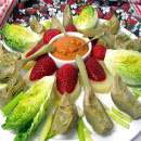 Montar la ensalada con cogollos de lechuga, las alcachofas y patatas, unos fresones y unos tallos de cebolleta. Regar con abundante citronette (zumo de limón y aceite) y servir con la crema aparte.