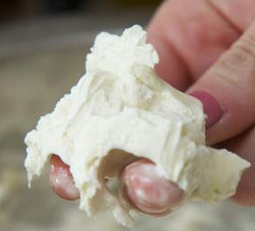 Saca la mezcla de la nevera y déjala unos minutos (10 más o menos) a temperatura ambiente. A continuación echa el bicarbonato sobre la mezcla y con la batidora mezcla bien hasta que quede como una crema, como en la foto de abajo.