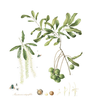 Los frutos de la macadamia o nuez australiana se encuentran cubiertos por una cáscara muy dura que protege la parte interna, el fruto comestible, que está compuesto en un 80% de aceite.