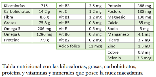 Vamos a ver los nutrientes que tienen 100 gramos de nueces de macadamia en profundidad en la siguiente tabla: