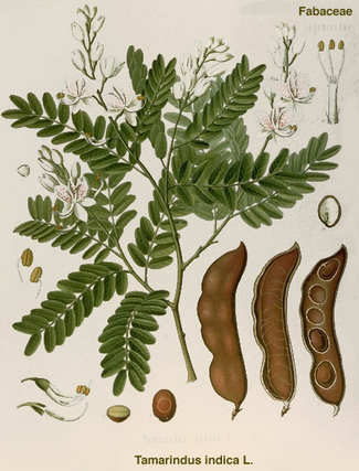 El árbol del tamarindo crece en zonas tropicales y es originario de África, aunque actualmente se cultivo se ha extendido a Asia y América. Este árbol puede alcanzar una altura de 20 metros, es muy frondoso, con flores que crecen en racimos y produce unos frutos que reciben el mismo nombre (el nombre tamarindo proviene del árabe y significa dátil de la India).  Del tamarindo se utiliza tanto su pulpa como sus hojas.