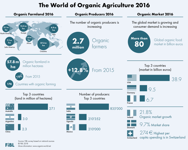 La agricultura orgánica surge como alternativa a raíz de una creciente preocupación por la calidad de los alimentos y la conservación de un medio ambiente cada vez más amenazado por la industrialización de la agricultura. Y hoy sus cifras están al alza, observándose un aumento en la demanda de productos orgánicos, la cantidad de agricultores dedicados a cultivar de forma orgánica y la superficie de tierra certificada orgánica, según se refleja en la última edición (2018) del estudio The World of Organic Agriculture, publicado por FiBL e IFOAM – Organics International (.pdf, 6.09 MB).