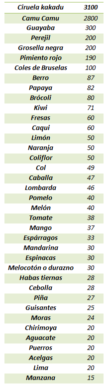Contenido en miligramos de vitamina C por 100 gramos de alimento