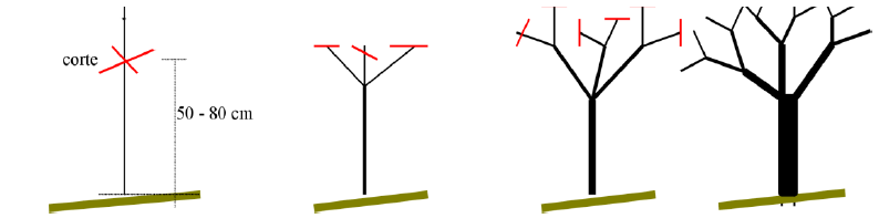 - a) Corte a 50 cm de altura para favorecer el desarrollo de ramas laterales.
