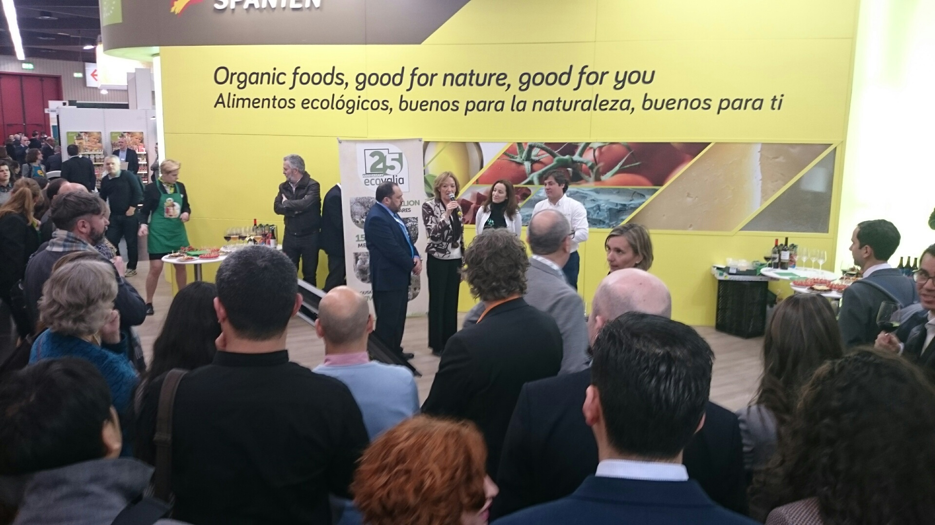 Ecovalía cumple 25 años trabajando para el desarrollo de la producción ecológica y lo ha celebrado en Biofach con la presencia de numerosas organizaciones del sector a nivel internacional, así como las empresas asociadas asistentes a la feria y la consejera de Agricultura, Pesca y Desarrollo Rural, Carmen Ortiz.