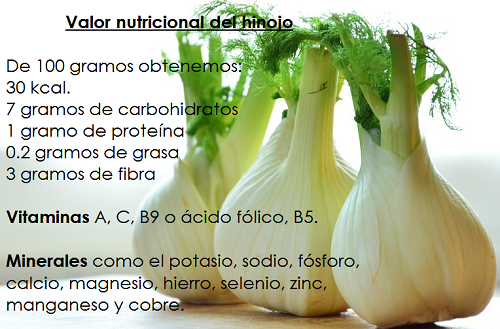 El hinojo nos aporta Vitaminas del grupo B (B3, B6, B9 o Ácido fólico), provitamina A, rico en Vitamina C y minerales como el potasio, fósforo, hierro, calcio o magnesio.