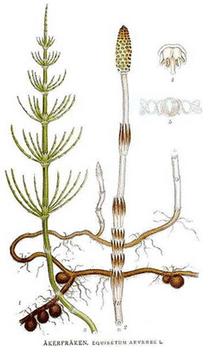 La cola de caballo, de nombre científico Equisetum arvense L, es un arbusto perenne perteneciente a la familia botánica Equisetaceae que podemos encontrar en América, Ásia y Europa.