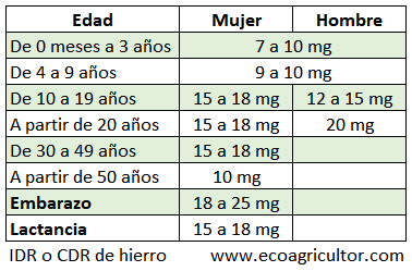 Aquí puedes ver una tabla con la Ingesta Diaria Recomendada (IDR) o Cantidad Diaria Recomendada (CDR) de hierro: