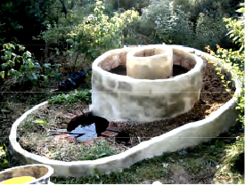 También se puede construir la espiral con el sistema COB, que fundamentalmente consiste en llenar sacos plásticos con arena (se cose el saco por la mitad y se llena por un solo lado)