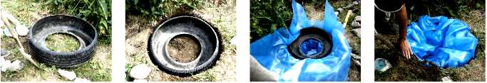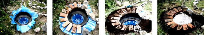 Una vez instalado el plástico, se pone el neumático dentro del hoyo y procedemos a cortar el plástico sobrante teniendo la precaución de dejar unos 20 cms. en el borde para que el agua no rebase . Una vez realizado esta parte debemos doblar el plástico hacia el interior del neumático y proceder a construir el borde exterior que puede hacerse con ladrillos ó bien con piedras grandes.