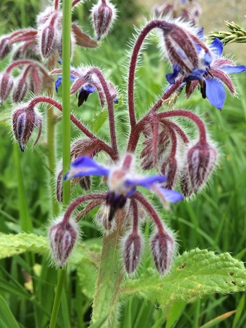 La Borraja, Borago officinalis, es una planta anual originaria del norte de África y de Europa. Puede llegar a alcanzar el metro de altura, posee hojas ovaladas, dentadas y grandes. Las flores de esta planta son de un de color azul violáceo muy llamativo y están cubiertas por pelitos.