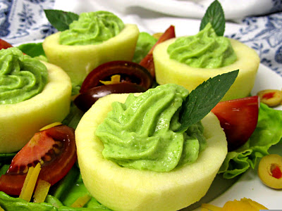 - Rellenar las medias manzanas con la crema y clavar una hoja de menta o hierbabuena en cada una.