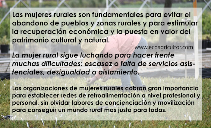 La mujer rural ha participado en la vida económica de su entorno, percibiendo los inconvenientes del trabajo pero muy pocas de sus ventajas. Nos encontramos en plena transformación hacia una situación más justa, principalmente liderada por las mujeres rurales y en un segundo plano por medio de políticas de igualdad de oportunidades que la equiparen al hombre, así como de mejora del propio medio para facilitar su desarrollo personal y profesional.