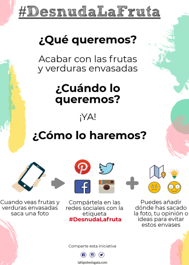 Para apoyarla, basta con sacar una foto del producto, fruta o verdura, envuelto en plástico de una forma que consideremos abusiva o innecesaria y compartirla en las redes sociales con el hashtag o etiqueta #DesnudaLaFruta.