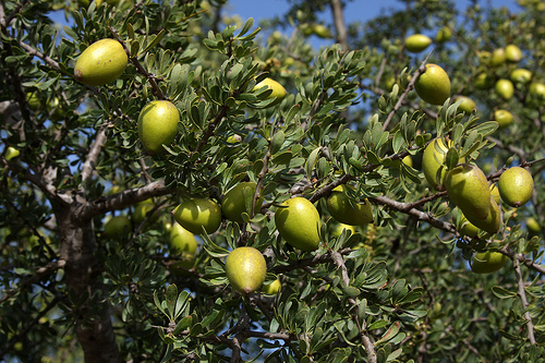 El árbol de Argán (Argania Spinosa) es de la familia de las Sapotaceae y es un árbol perenne, originario de Marruecos. Puede llegar a medir hasta 10 metros y a vivir más de 150 años. Posee espinas y su tronco es agrietado y rugoso. Sus hojas, muy numerosas, son pequeñas y ovaladas con flores amarillas de 5 pétalos que florecen en Abril.