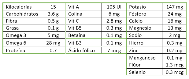 Aquí puedes ver una tabla con los nutrientes del pepino detallados. Por cada 100 gramos de hortaliza, el pepino nos aporta: