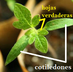 Podrás reconocer las hojas verdaderas de los cotiledones (primeras hojas que salen de la semilla) porque éstos últimos tienen forma ovalada mientras que las hojas verdaderas tienen la forma definitiva de la hoja típica de la tomatera pero más pequeña.