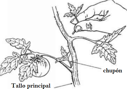 A las tomateras les salen ramas que no dan fruto, pero que están consumiendo recursos de la planta. Eliminando estas ramitas, también conocidas como «chupones», a través de una sencilla poda favorecemos la formación y desarrollo de los frutos. Los chupones son ramitas que salen de la axila de otra rama principal.